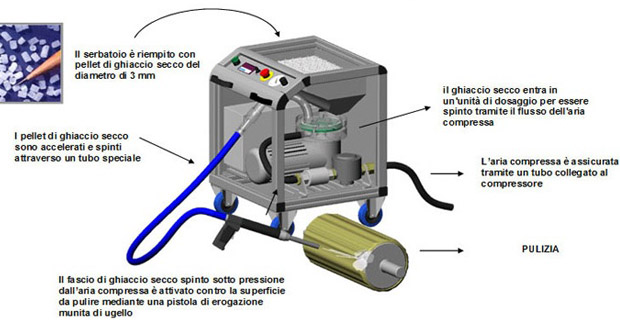 I pellet di ghiaccio secco vengono accelerati nella corrente d’aria compressa e colpiscono a una velocità subsonica (300 metri al secondo) le incrostazioni che in tal modo vengono asportate dalla superficie del materiale da trattare.