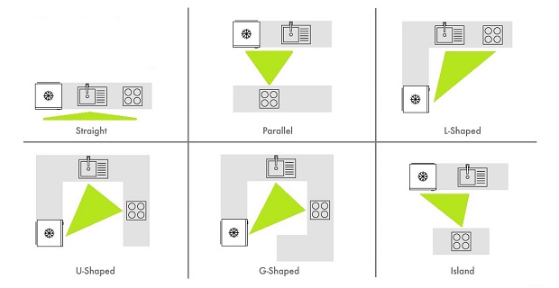 Il triangolo di lavoro della cucina è quel triangolo i cui lati congiungono idealmente le aree di lavaggio (lavello), cottura dei cibi (fornelli) e conservazione (frigorifero).
