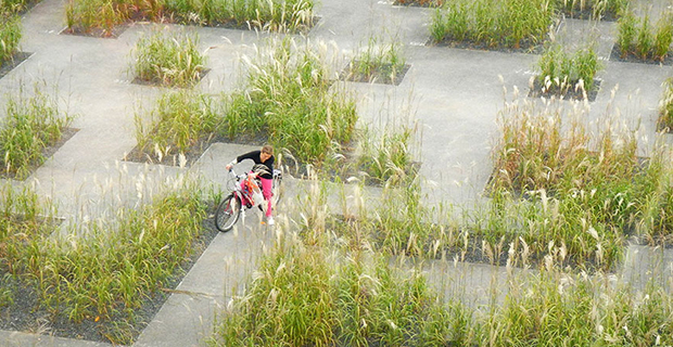 I moduli neri del codice, segnati con il gessetto sul foglio asfaltato, sono stati forati e divelti per la piantumazione delle graminacee. Divenuti i micro-spazi verdi nel labirinto temporaneo, sono stati occupati interamente da flessuosi e altissimi miscanti sinensis, mentre qua e là si trovano sedute rosse di varie altezze e panche di legno. L’effetto finale è un giardino ritagliato nell’asfalto con piante scapigliate dai bagliori argentei, i cui colori e l'aspetto informale ricordano i campi di lino.