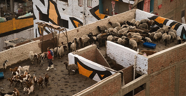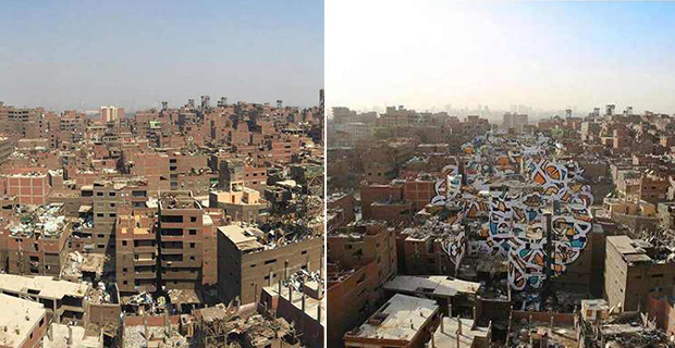 Nel sobborgo di Manshiyat Naser a sud-est del Cairo, gli "zabaaleen" (uomini della spazzatura) riversano ogni giorno circa 5 mila tonnellate di rifiuti della capitale egiziana, con carri trainati da asini e camioncini sgangherati. Pile smisurate di plastica e vestiti logori mal assicurati da corde, separati e rivenduti per poche lire. È qui che l'artista di strada franco-tunisino El seed ha realizzato uno stupefacente murales sulle pareti di 40 edifici. Con il progetto "Perception" ha portato un po' di arcobaleno e speranza nella "città spazzatura", ignorata dalle autorità locali ma indispensabile perché le aree limitrofe non soccombano, come nella Leonia di Calvino, sotto crateri d'immondizia.