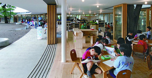 L’enorme quantità di luce naturale che investe il Fuji Kindergarten, la spazialità generata ed il design divertente della struttura incoraggiano i bambini a sentirsi liberi ed a crescere esprimendosi spontaneamente, avendo il cielo come soffitto.