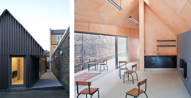 L’edificio di Londra è a un piano ed è costruito intorno ad un telaio di legno, ricoperto all’esterno da una pelle di pannelli di fibrocemento ondulato che realizza un rating A+ nella Guida Verde BRE; all’interno pareti e soffitti sono rivestiti da una superficie di compensato continua certificata FSC e PEFC proveniente da fonti sostenibili.