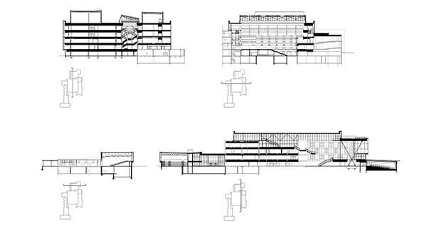 A nord e a sud ad esempio troviamo due teatri da 240 posti che ancorano l’espansione al vecchio edificio e risultano spazi flessibili che possono ospitare conferenze ed eventi o essere spazi espositivi.