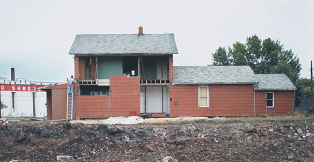 Gordon Matta Clark bucando i muri – e con essi la separazione interno/ esterno – denunciava l’apparente solidità di un’architettura fatta di strati, incastro o giustapposizione di diversi materiali (solai in c.a., linoleum, listelli di legno, carta da parati…). La casa, con fenditure verticali o fori enormi, si rivela con onestà. E con onestà il giovane dichiarava la natura delle sue performance, manifestazioni artistiche e non architettoniche (a dispetto degli studi e del nome del gruppo creato). Mentre gli architetti degli anni Settanta – sorprendentemente simili ai contemporanei – erano costantemente alla ricerca di aree edificabili per elevare costruzioni e profitti, Gordon scovava aree e palazzi abbandonati per eseguire i suoi ‘building cuts’. Rivelando, così, al pubblico i problemi della società, lo squallore dei suburbi delle città e un legame fortissimo fra arti visive, architettura e filosofia. Lo spazio, tagliato e ricucito, diventa mentale, come fosse una manifestazione simbolica o un’anarchica architettura. La ‘superbia protettiva’ delle facciate si sottomette alle operazioni chirurgiche di Gordon. L’alternativa all’architettura tradizionale diventa la trasformazione e la riflessione sull’esistente, sull’edificato acquistato per pochi dollari: in Splitting taglia una casa suburbana in due, in Garbage Wall realizza una parete con materiali di scarto, in Circus incide solchi enormi circolari su solai e pareti, in Bingo asporta parti di pavimento, soffitti e pareti ad edifici abbandonati.