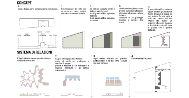 Il principio generatore dell’intero sistema compositivo è il recinto; questo avvolge tutto il lotto isolandolo dall’intorno, privo di qualsiasi valenza architettonica. Si tratta di un muro pieno, alto più di 3 metri, la cui continuità si interrompe eccezionalmente con alcuni varchi che consentono l’accesso al giardino botanico e alla scuola di infanzia.