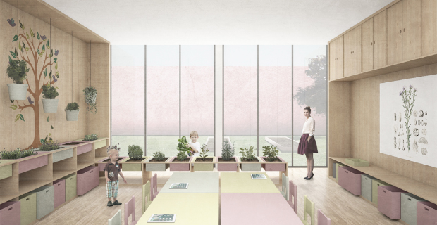 La nuova scuola di infanzia deve accogliere un totale di 140 alunni di età compresa tra i 3 ed i 6 anni, suddivisi in 5 sezioni, per un numero massimo pari a 28 alunni per sezione. Nel pieno rispetto del programma funzionale riportato nel DPP, il progetto di AS.IN.O. prevede: un’aula per ogni sezione più una sesta definita “di rotazione e potenziamento”; sala docenti e sala collaboratori, ciascuna con i relativi servizi; sala mensa con area cucina e altri spazi serventi; aree attrezzate per attività sportive e didattiche all’aperto; il giardino botanico.
