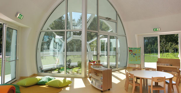 Per quanto riguarda gli impianti, il centro d’infanzia utilizza la ventilazione meccanica con recupero di calore tramite sistema geotermico che alimenta un impianto radiante a pavimento; i pannelli solari per la produzione di acqua calda sanitaria coprono il 60% del fabbisogno mentre i pannelli fotovoltaici ad alta efficienza raggiungono una potenza totale di 7,2 kWp.