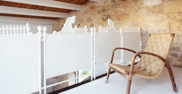 Elementi di recupero in casa Talìa: la testiera da letto diventa ringhiera. In questa immagine è visibile il muro in pietra a vista, e il tetto in travi di legno e canne di bambù adoperati per il restauro delle abitazioni. Foto, DesignRulz.com