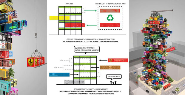 I container, sono utilizzati per il trasporto di merci su navi, camion e treni, ma con alcuni adattamenti, possono essere sfruttati anche come case di emergenza per terremotati o per ambulatori. Non è però usuale vederli come parte integrante di un edificio, ecco perché guardando il progetto dell’Hive–Inn, colpisce molto l’originalità di questo hotel. Ecosostenibilità, forme futuristiche e colori sgargianti sono le parole che racchiudono la particolarità di questo progetto, proposto dagli architetti Ova Studio di Hong Kong, che ha suscitato molto interesse per la sua massima flessibilità e adattabilità alle funzioni più svariate.