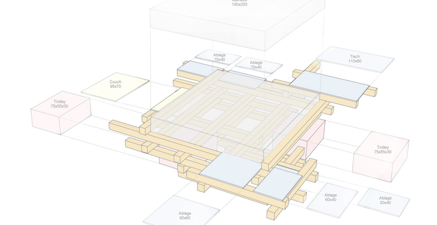 Le piattaforme della zona notte combinano al letto, come isole, le funzioni che di solito assolverebbero comodini, cassettiere, armadi e panche, eliminando qualsiasi arredamento ridondante e supplementare, al fine di rendere evidente e visibile la storia dell’edificio, mostrando le nude superfici di soffitti in mattoni e pavimenti, senza di fatto trasformare l’ambiente grezzo.