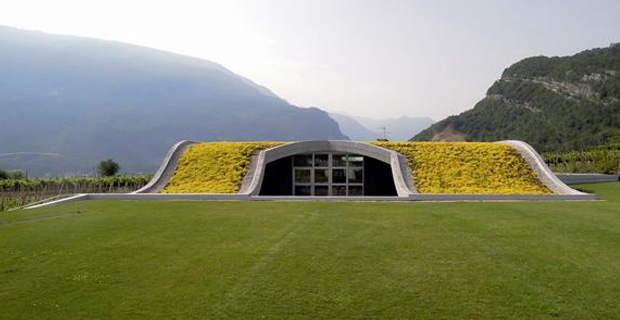 La natura si integra con l’architettura sia grazie all’abbraccio del sottosuolo, sia per il tetto verde che, con parte dei vigneti, ricopre la cantina stessa.