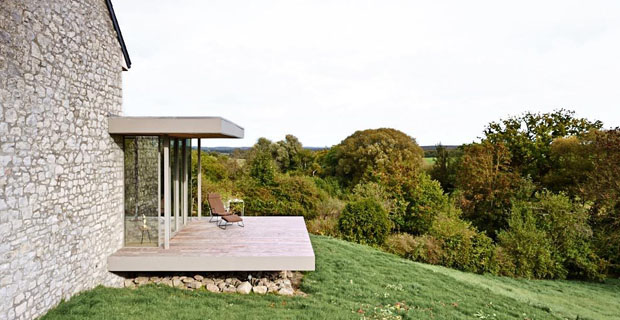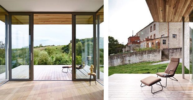 Due lastre orizzontali in legno e pareti completamente vetrate delimitano il nuovo soggiorno: il pavimento risulta leggermente sospeso rispetto al livello del giardino in modo da creare uno spazio per accatastare la legna, mentre la copertura sporge rispetto al filo della vetrata per proteggere dal sole e per riparare dagli agenti atmosferici il terrazzo.