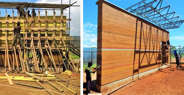 Anche il suolo su cui sorge l’edificio occupa un ruolo rilevante nel processo. Venendo studiata e testata in maniera scientifica, con la stessa precisione con cui si fa medicina, attraverso l’analisi della sua composizione chimica ed altre accurate prove, esperimenti e ricerche, la terra del sito consente la realizzazione della muratura portante di 60 cm di spessore. L’elevata presenza di argilla al suo interno permette di conferire all’intero composto plasticità e resistenza, rendendola idonea alla costruzione. La terra viene estratta al di sotto dello strato arabile, al fine di raggiungere un’elevata resistenza meccanica e di eliminare le sostanze organiche presenti in superficie, e in seguito lavorata attraverso la tecnica del “pisè”. In questo modo il composto, trattato con acqua, viene disposto all’interno di casseformi di legno e successivamente lavorato tramite pistonatura. Essendo il composto non sottoposto ad un processo di cottura, questa tecnica di lavorazione della terra cruda consente un risparmio energetico notevole, circa il 90% rispetto all’utilizzo di una terra cotta. Il materiale così messo in opera, unito al notevole spessore conferito alla muratura, garantisce un’inerzia termica tale da mantenere costanti temperatura e umidità all’interno dell’edificio.