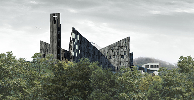 La parte edificata della nuova chiesa, che corrisponde al solo 9% dell’area di intervento, è pensata per minimizzare l’impronta al suolo del progetto. Posizionati ad ovest della piazza-sagrato, l’aula liturgica dalla forma a stella di circa 840 mq, che può ospitare fino a 300 fedeli, e l’oratorio, sono disposti su due livelli sovrapposti, consentendo così di risolvere il dislivello naturale di 5 metri, ad oggi impraticabile, trasformandolo in spazio fruibile. La forma e l’orientamento sono studiati per ottenere un ottimo comfort interno, garantendo illuminazione e ventilazione naturale anche al piano inferiore. A est della piazza si trova la casa canonica che ospita l’accoglienza per i fedeli, le aule per la catechesi e i depositi, collegata all’aula liturgica tramite una pensilina.