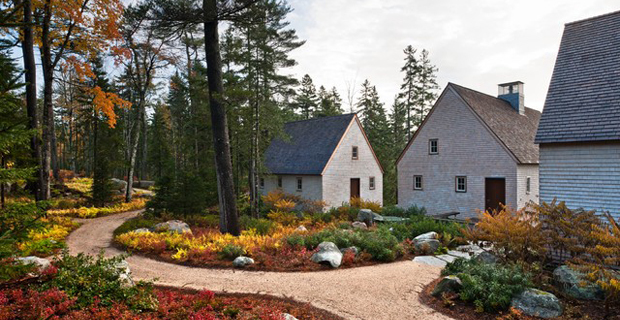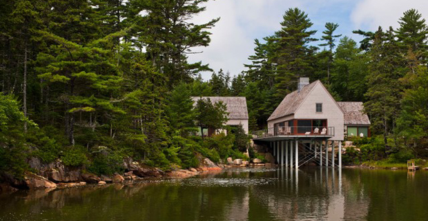 Questa casa è composta da tre cottage situati su una striscia costiera boscosa del Maine. I due cottage che costeggiano il lago sono destinati alle stanze da letto, mentre gli spazi a giorno si trovano nel volume che si innalza su palafitte.