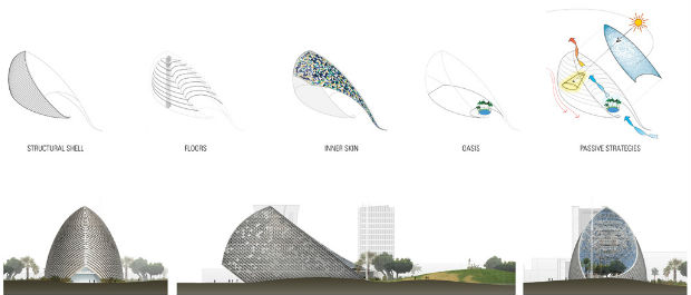 L’architetto bolognese, come egli stesso spiega, ha ideato un edificio secondo i principi della bioclimatica e in particolare secondo le tecniche di raffrescamento naturale messe a punto nel passato. La tu’rat pare essere l’ispirazione principale dellaforma aerodinamica del progetto, convessa sul fronte nord –per deviare i venti caldi– e concava a mezzogiorno per captare le brezze fresche notturne e favorire così la ventilazione naturale dell’edificio.