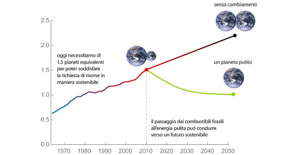L’architetto integra il suo concetto di sostenibilità con un grafico che esprime la necessità di disporre di un Pianeta e mezzo pro capite per soddisfare la richiesta di risorse da parte dei Paesi “civilizzati” secondo gli standard odierni e delinea due scenari possibili con orizzonte 2050: il primo sarebbe segnato dalla necessità di disporre di due Pianeti pro capitese non si attuassero opportuni cambiamenti nei tempi utili indicati dagli scienziati, mentre il secondo sarebbe segnato dal riuscire a mantenere gli standard di benessere riducendo i consumi di risorse (un Pianeta).