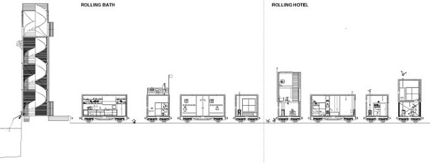 Definito “Rolling Masterplan”, il piano parte dall’idea di utilizzare le esistenti linee ferroviarie dismesse per trasportare nuovi edifici a servizio della comunità, che possano muoversi su ruote a seconda della stagione o degli eventi: un albergo mobile, una piscina e una sala concerto.