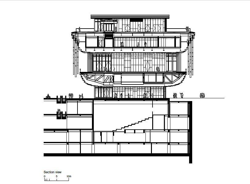 La facciata dinamica si presenta come una tenda mobile a tre strati composta da grossi tubi di bronzo. Malgrado la pesantezza degli elementi tubolari, simili per forma alle canne di bambù, il movimento della membrana alleggerisce l’intero complesso, viscerando gli ambienti interni, con i loro spazi e le loro vetrate. Quando la cortina di tubi è completamente aperta, l’elemento primario che viene scoperto è il balcone della sala principale, anch'esso in bronzo. Le pareti esterne della sala sono completamente vetrate e, a facciata aperta, il balcone sembra spingersi all’esterno con la sua imponente base bronzea, come se volesse imperativamente uscire dall’edificio.