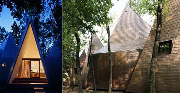Nasu si trova nella prefettura Tochigi, in Giappone, una località estiva molto conosciuta caratterizzata da fitte foreste di diverse specie arboree. Lo studio Hiroshi Nakamura & NAP è incaricato di costruire l'abitazione per una coppia amante della natura e dedita nei weekend all'agricoltura biologica. Il loro desiderio era di preservare il più possibile l'ambiente naturale, gli alberi snelli e alti di cui godere le stagioni, appendere amache e curare un piccolo giardino. Da qui l'idea dei progettisti di evitare costruzioni invasive a larga scala, realizzando diverse stanze sulle superfici in pendenza ricucite per ottenere un'unica abitazione. La forma del tetto è primitiva, le stanze si concludono con "cappelli a punta" per catturare la luce diretta ma permettono la crescita radiale dei rami. Tale sistema riduce, inoltre, i costi di riscaldamento e raffredamento degli ambienti. Dall'esterno spuntano tra i tronchi piccole case, mentre all'interno si coglie la coesione, la raffinatezza progettuale e gli spazi luminosi e confortevoli.