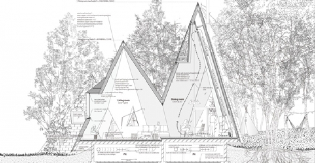 Estesa su una superficie di circa 156 mq, la casa ricorda le tende dei nativi americani e del popolo Jomon (antichi giapponesi), con volumi ridotti ad un terzo: le altezze variano così da un massimo di 8 m agli standard minimi di 2,6 m. La famiglia può riunirsi attorno al tavolo centrale o al camino, seduti lungo i muretti uno di fronte all'altro: il legame è rafforzato dall'architettura degli interni e ricorda le case dei nostri nonni. Durante le notti scure, la luna illumina gli interni finestrati, flebili si sentono gli animali selvatici e i tetti appuntiti tutelano dall'umidità, dagli insetti e dalla neve.