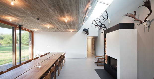 Hunting Lodge è un rifugio di caccia ricavato all’interno di una collina alla quale si appoggia e ne diventa l’ideale prolungamento grazie a prato che lo riveste. Solamente la facciata principale si apre con ampie vetrate verso la pianura alluvionale e la foresta, mentre il resto della costruzione è annegata nel terreno.