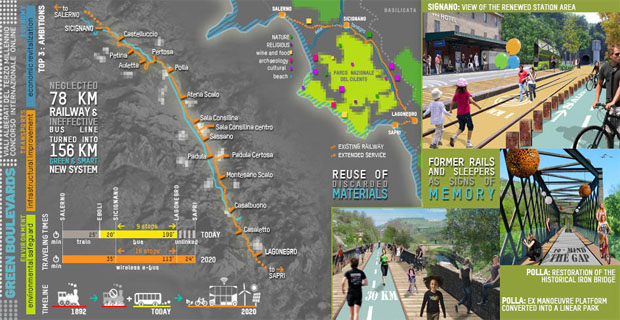 [ia]²: Il progetto persegue obiettivi di sostenibilità nel senso globale del termine, quindi con riferimento ad aspetti ambientali, sociali ed economici. Il punto di partenza è stato lo studio della tratta ferroviaria esistente e dei possibili sviluppi con riferimento a due aspetti principali: – recuperare il tracciato, come strategia di rivalorizzazione del paesaggio degradato e per evitare il consumo di nuovo suolo per nuove opere di urbanizzazione, andando a sovrapporre alla vecchia rete ferroviaria in disuso una serie di nuove infrastrutture ed attrezzature urbane; – raggiungere gli obiettivi di progetto con costi inferiori a quelli derivanti dalla ristrutturazione dell’infrastruttura ferroviaria fortemente degradata. Le proposte adottate sono state riassunte in un quadro economico preliminare che ha mostrato la fattibilità economica dell’intervento e la sua convenienza in termini di esecuzione ed esercizio.