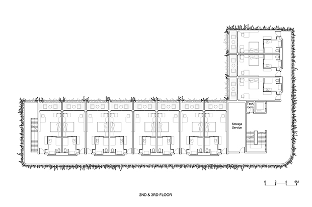 I prospetti dell’Hotel Babylon sono realizzati mediante delle lamelle fisse in calcestruzzo ricoperte da piante rampicanti. Questo involucro consente di avere un buon ombreggiamento, una giusta riservatezza e privacy per i clienti dell’hotel senza però ostacolare il passaggio e il ricircolo dell’aria. I materiali sono stati pensati per armonizzarsi con la natura circostante. Inoltre questa disposizione consente di minimizzare la radiazione termica dei raggi solari nella stagione estiva, caratterizzata dal clima tropicale, creando una zona idonea alla crescita delle piante.