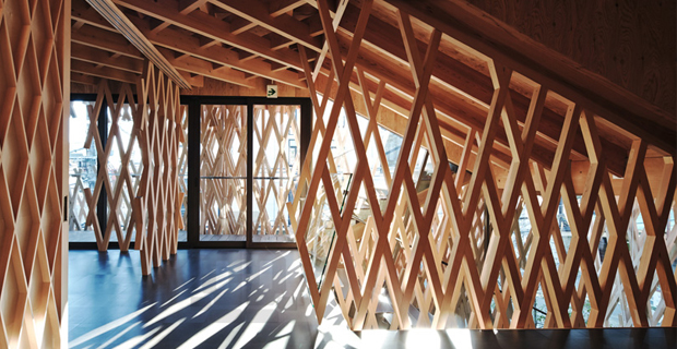 Questo sistema, progettato dall’ingegnere Jun Sato dello studio Kuma, parte dall’antica tecnica ad incastro chiamata Jiigoku Gumiche consiste nell’incrociare elementi in legno verticali e trasversali della stessa lunghezza al fine di creare un reticolo, il tutto senza l’utilizzo di colle e chiodi.