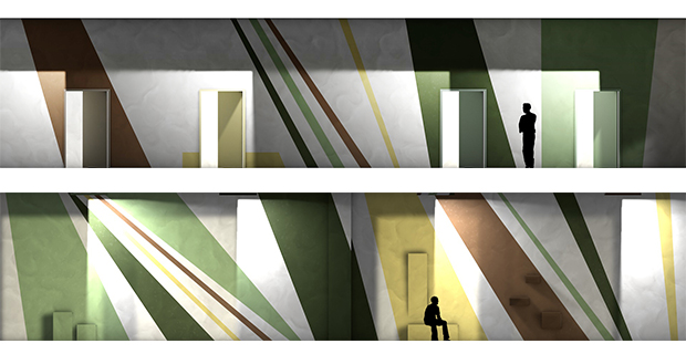 Si è così raggiunto l’obiettivo di ridefinire gli spazi dedicati al lavoro, alla creatività, alla formazione e soprattutto alla socialità dei detenuti. Ad ogni stanza è stato abbinato un colore, toni distensivi e che richiamassero la natura. E visto che in città i negozi e le botteghe si affacciano sulle strade richiamando ed attirando con vetrine espositive colorate abbiamo pensato di portare il colore fuori dalle stanze, direttamente sul corridoio trasformato in corso. Le fasce di colore si rincorrono sulle superfici disegnando un vortice dinamico e scandendo lo spazio come nella realtà esterna. In corrispondenza di ogni porta abbiamo poi pensato ad un arredo integrato utile all’attività effettivamente ospitata nella stanza.