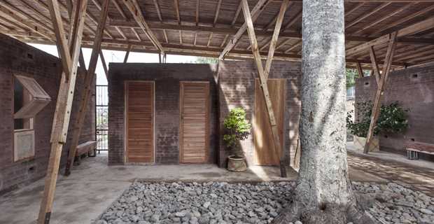 team realizza una struttura in legnoincastrata in un basamento in cemento e mattoni e che sorregge un’ampia copertura sospesa di 600 mq. Quest’ultima, insieme ad una corte aperta ombreggiata da due alberi di Durian, favorisce la ventilazione degli ambienti: i cinque volumi in mattoni ospitano un laboratorio, le aule, gli uffici e la cucina. La diffusa presenza di pilastri a Y prodotti in serie dà la sensazione di essere immersi in una foresta di alberi di cannella: questa percezione diventa realtà all’esterno, dove l’intera costruzione è davvero avvolta da una fitta selva.