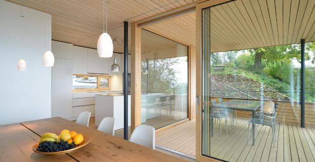 Dal progetto dello studio k_m Architektur nasce la Wohnhaus, casa unifamiliare situata lungo un pendio rivolto verso la città di Weinfelden. Il prospetto sud offre ampie vetrate che consentono una splendida vista panoramica sulle Alpi svizzere e sul lago di Costanza. Questa scelta architettonica ben si lega con i fabbisogni energetici, consentendo l’ingresso dei raggi solari durante i mesi invernali, mentrei raggi estivi sono schermati dall’aggetto formato dal terrazzo che circonda l’intero corpo di fabbrica. Anche gli elementi a sbalzo garantiscono la protezione dall’eccessiva insolazione dell’edificio nei mesi caldi.