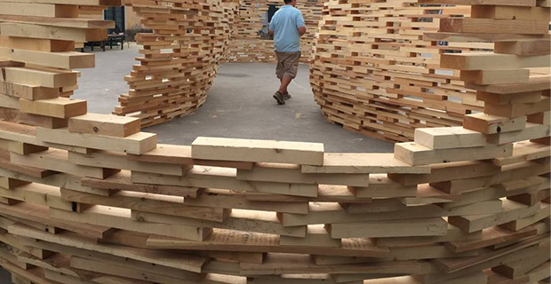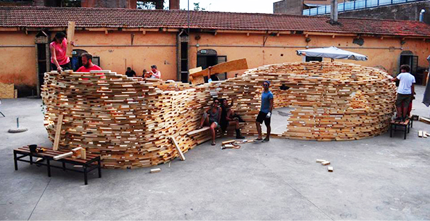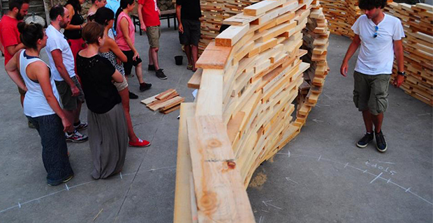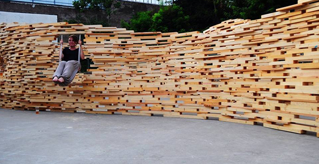Autocostruzione e progettazione partecipata significano cura degli spazi, sperimentazione e acquisizione di competenze pratiche in pochissime ed intense giornate. Perciò, sopratutto in estate, moltissime associazioni e atelier organizzano laboratori, che si trasformano immancabilmente in esperienze preziose per tutti i partecipanti. Non fa eccezione il workshop Off the Cuff tenutosi a Roma nei giardini di Monk dall'8 al 10 luglio, da cui è nata un'installazione di legno dalle forme sinuose. Lunghe sedute, un'altalena e diverse aperture vivacizzano il padiglione che si erge per sovrapposizione di listelli sfalsati e chiodati. Vuoti e pieni ricordano molte installazioni temporanee d'autore; sulla pianta ad otto le pareti si spanciano e si ritraggono creando piacevoli scorci e dividono irregolarmente l'interno ed esterno del labirinto.
