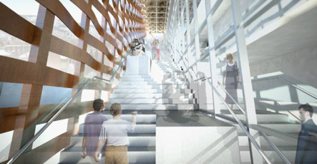 Il primo è una grande scalinata che dà ai visitatori l’accesso diretto alla terrazza sul tetto giardino delle sculture, situato al terzo piano. Lo scalone facilita la transizione da un ambiente esterno alla galleria formale, costituendo al contempo uno spazio espositivo non convenzionale.