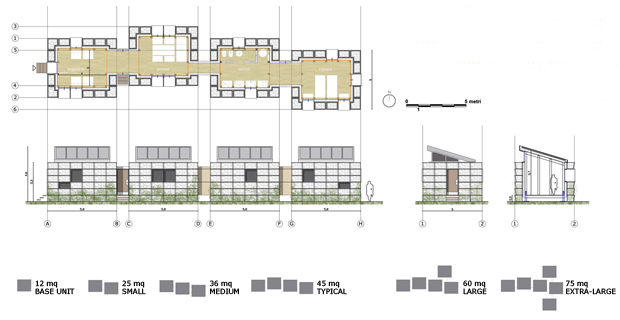 Con la reiterazione dei moduli–struttura, pavimento, parete, gabbia si ottiene una cellula abitativa di 12 mq: secondo le esigenze si possono creare composizioni di più cellule accostate e collegate tra loro a piacere. Anche gli arredi interni sono disposti secondo una griglia modulare.