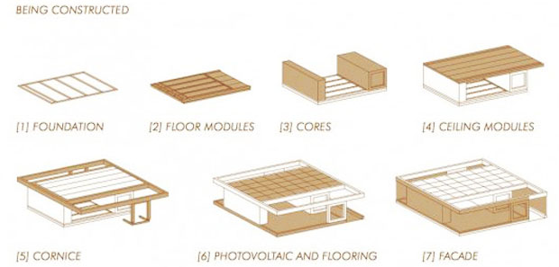 La metodologia costruttiva si declina nei vari componenti di involucro, fondandosi su un sistema portante scatolare e modulare in legno, a sua volta isolato con cellulosa. Così quattro moduli a pavimento, posizionati orizzontalmente con due nuclei di irrigidimento, contengono i servizi e quattro moduli a tetto sorreggono i pannelli FV.