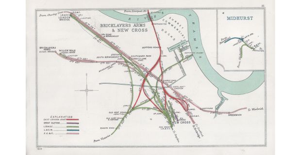 Una mappa del 1914 delle linee che convergono verso la zona della London Bridge Railway Station.
