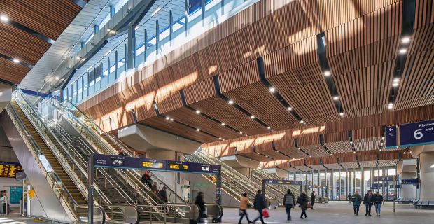 Sotto i binari, il nuovo atrio spazioso, più grande del campo del Wembley Stadium, crea un grande spazio a livello stradale che è illuminato dalla luce naturale filtrata attraverso le pensiline della piattaforme sovrastanti. Molto suggestivi e accoglienti gli spazi pubblici dove l'uso di un materiale come il legno attutisce la percezione di un ambiente necessariamente caotico e di passaggio quale è una stazione ferroviaria.