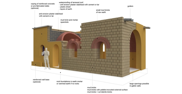 Immagine: schema costruttuttivo della struttura della volta nubiana vista in uno spaccato assonometrico, con indicazione dei componenti principali e dei materiali (fonte: Nubian Vault Association)