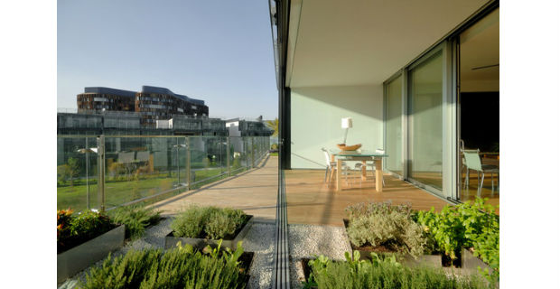 Ogni residenza è connotata dalla presenza di una serra prospiciente al giardino interno che esplica una doppia funzione: una ambientale di termoregolazione dell’abitazione e una architettonica di congiunzione ideale dello spazio interno al paesaggio verde esterno, così da creare uno spazio filtro su cui si apre la zona giorno degli appartamenti.