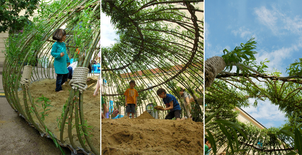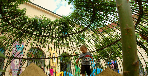 Kagome è una particolare tecnica d’intreccio, ma anche un gioco tradizionale e una filastrocca giapponese. Dalla duplice idea della tessitura e del gioco nasce il concept per l’area gioco del MQW, nel noto MuseumsQuartier a Vienna. Ai progettisti è richiesto di attrezzare il cortile come un parco per i piccoli, considerando delle schermature per le giornate calde. Lo studio viennese PPAG, in collaborazione con Simon Oberhammer e Stefanie Meyer, opta per una struttura vivente, definita da tralicci di salice che chiudono una superficie di sabbia.