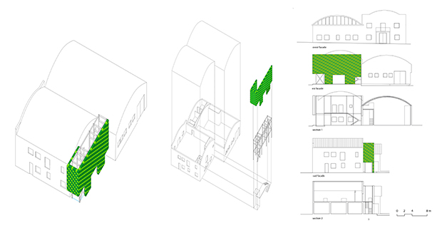 La nuova sede della fondazione ricavata negli spazi dei capannoni è foderata con cassette di plastica per la frutta in due tonalità di verde,alternate in modo da creare un motivo a righe diagonali. Le cassette da frutta, da un lato definiscono un edificio simbolo, riconoscibile e identitario in un contesto anonimo, dall'altro elevano un modulo e materiale grezzo, dopo ricerche e sperimentazioni decennali, a elemento espressivo e decorativo architettonico.