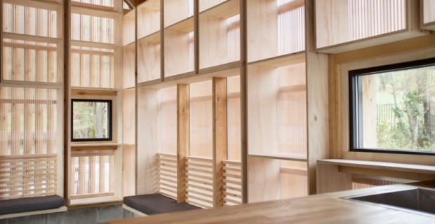 La prima mossa progettuale è stata quella di “estrudere” nella parte posteriore il volume della struttura, creando uno spazio riparato dietro la rimessa, un giardino d’inverno. I 40 metri quadrati di edificio risultanti sono stati totalmente rivestiti: la parte anteriore, originaria, è stata ricoperta da listelli di pino massello locale, mentre nella parte posteriore le lamelle di pino sono più rade e il policarbonato lascia filtrare la luce tra interno ed esterno.