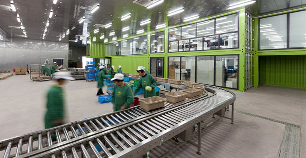 I volumi dell’ampliamento sono stati creati con il riutilizzo di container per il trasporto della verdura che sono diventati sia l’elemento costruttivo base sia il modulo che ha guidato ogni scelta compositiva. I container sono stati collocati in modo da creare un’alternanza tra pieni e vuoti, spazi esterni e spazi interni collegati attraverso una serie di ponti e passerelle. La continuità tra ambienti confinati e ambiente esterno è sia visivamente che materialmente possibile: le terrazze diventano sia luoghi di svago sia luoghi di lavoro. La configurazione dell’edificio muta a seconda delle esigenze: i container, infatti, sono apribili da tutti i lati disponibili.