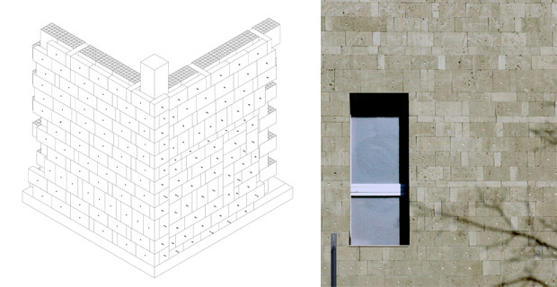Da lontano, la pelle dell’edificio appare come un manto dalle nuances delicate (beige, gialle, ocra chiaro); da vicino, si nota come i conci siano impreziositi dalla lucentezza di un forellino centrale e l’assenza del collante cementizio tra le fughe orizzontali e verticali.