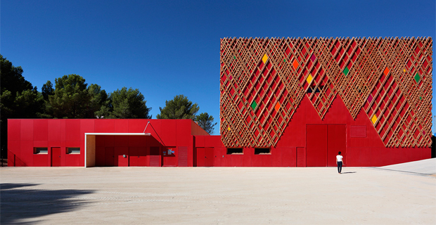 L’edificio si trova nel cuore di un bosco di pini, nel quartiere Domaine d’O di Montpellier, e accoglie i visitatori con un prospetto vivace e colorato che ricorda la maschera di Arlecchino. La struttura rosso fuoco è infatti rivestita da una griglia di legno le cui assi sono disposte in modo obliquo a ricordare il tessuto della famosa maschera.
