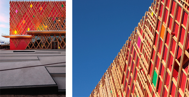 Pannelli colorati riempiono alcuni rombi nati da questi incroci che, se di giorno conferiscono alla facciata un aspetto dinamico e divertente, di notte la trasformano in una colorata lanterna luminosa.