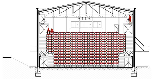 L’aspetto più interessante dell’intero progetto è il suo carattere ecosostenibile, dato non solo dai materiali utilizzati, ma anche dalla possibilità di smontare l’edificio completamente per poi ricostruirlo in un altro luogo. Aspetto per altro molto stimolante se si pensa che si tratta di un teatro, in questo caso potrebbe non essere lo spettacolo a spostarsi di città in città ma il teatro stesso!