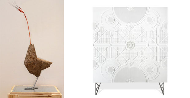 Andrea Minghali (designer di Aradeo, Lecce) con “Mike the Headless” propone un vaso decorativo in canapa, calce e acciaio costruendo un gallo senza testa allegoria della società basata sulla sopravvivenza senza ragione e Marco Giovinazzo (architetto di Neviano, Lecce) reinterpreta lo scheletro urbano traducendolo in geometrie decorative per arredi di cui “Urbano” è proprio un esempio.