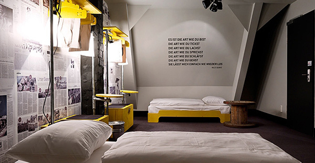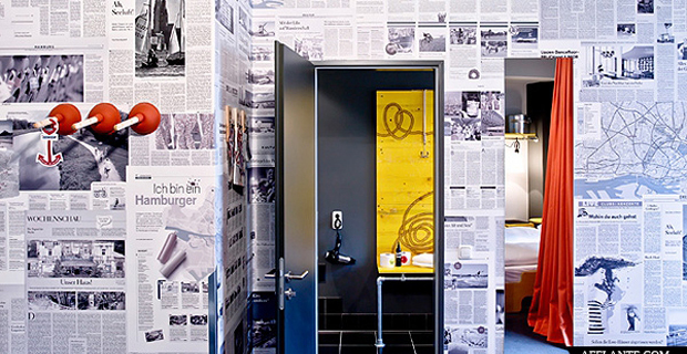 Un caso curioso ci viene proposto dallo studio tedesco di interior design, Dreimeta, che ricorre a tale sperimentazione con grande risultato nella rielaborazione degli interni di un ostello ad Amburgo.